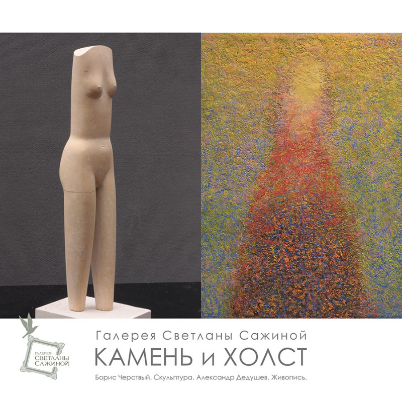 Проект «КАМЕНЬ и ХОЛСТ», собравший в одном пространстве живопись Александра Дедушева и скульптуру Бориса Черствого, с первого взгляда кажется, нас ничем новым не может удивить: совместная выставка – весьма привычное явление. Тем не менее, это не случайное объединение двух художников. Нельзя не заметить, что при всей разности творческих индивидуальностей, художники данного проекта имеют немало общего. Прежде всего, это схожее эстетическое отношение к миру и схожий тип художественного мышления. Для обоих художников свойственно тяготение к философской глубине. Они считают выразительность пластического языка необходимым условием. Аллегории, символы для них нечто большее, чем прием – это привычный язык в их творческом самовыражении.